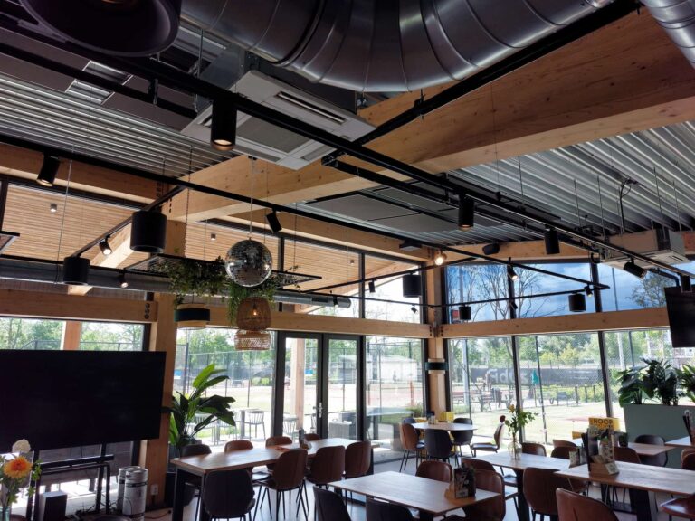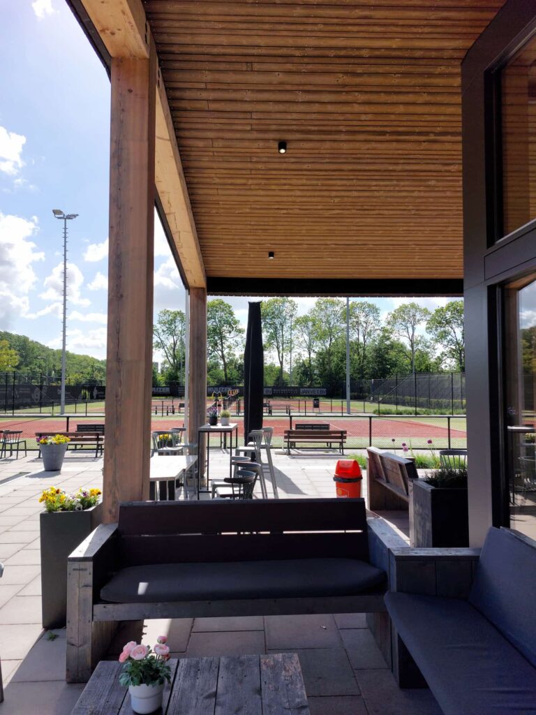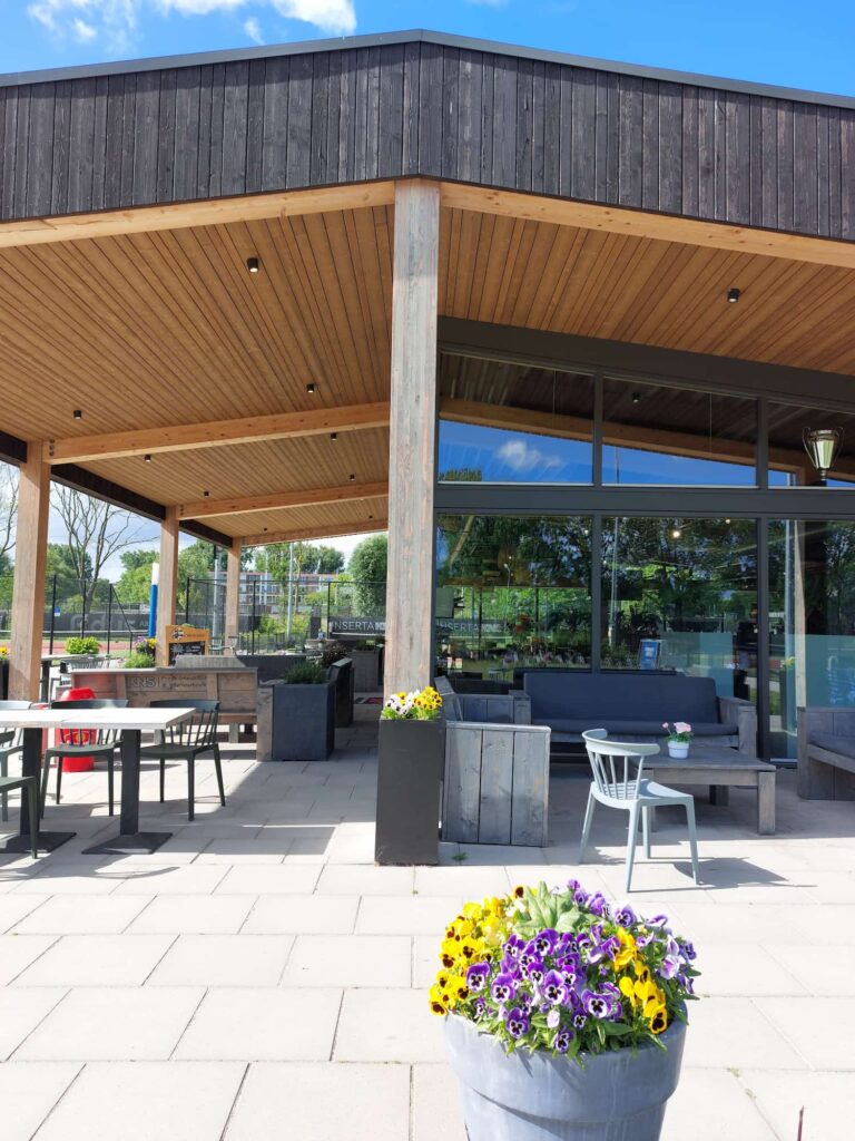 De kantines vormen het kloppende hart van beide verenigingen: uitnodigend, transparant en met ruim zicht op de speelvelden door het gebruik van grote glaspartijen. Slim ontworpen dakoverstekken zorgen in de zomer voor schaduw en voorkomen oververhitting, terwijl ze in het voor- en najaar juist optimaal gebruik maken van zoninstraling voor verwarming. Bovendien bieden ze beschutting bij onverwachte regenbuien, zodat ook buiten gasten comfortabel kunnen blijven genieten.