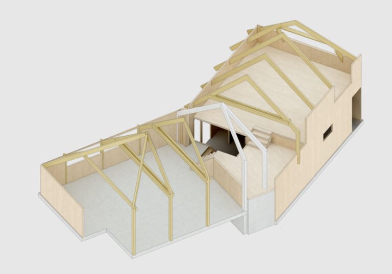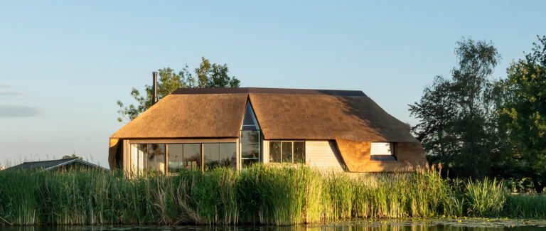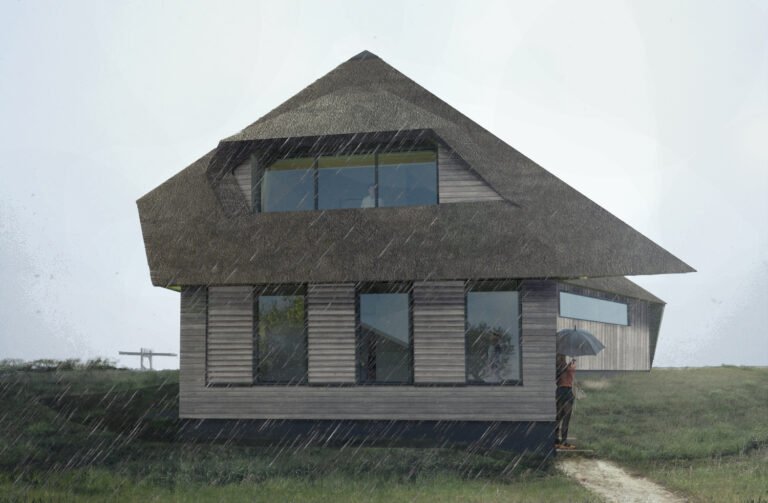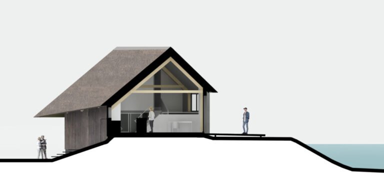 Het polderhuis heeft twee verdiepingen en het dijkhuis is enkellaags. De gedraaide volumes worden beschermd door eenzelfde rieten kap. De vorm van de kap volgt de meeste keuzes tijdens het ontwerpproces. Alleen het driehoekige daklicht in de knik blijft onveranderd. Dit noorderlicht brengt verrassend veel daglicht in de woonruimte.