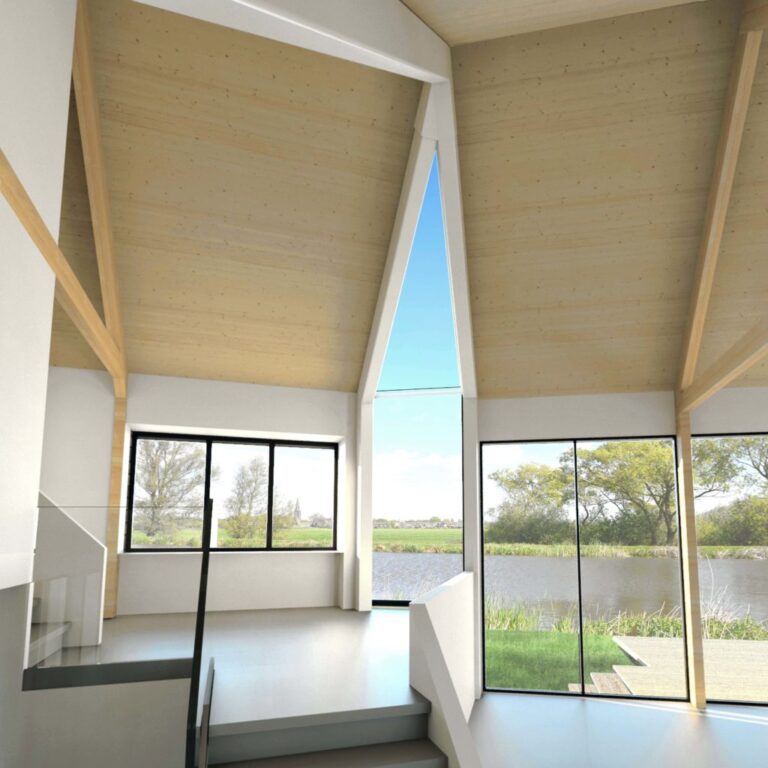 In het Hollandse buitengebied mag een vervallen dijkhuisje plaatsmaken voor een nieuw dijkhuis. Het nieuwe huis blijft aan de dijk, maar knikt ook de polder in. De knik opent het huis naar het noorden. In het lichte hart van het huis verbinden trapsteken de split levels van de poldervloer, dijkvloer, entresol, en zoldervloer.