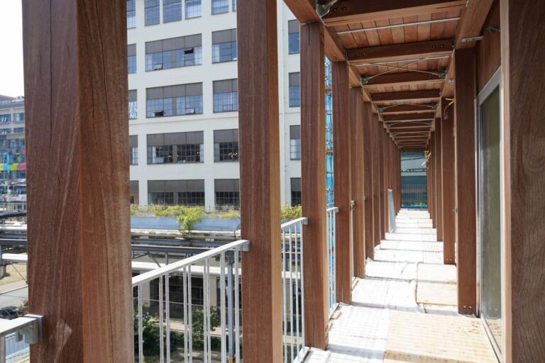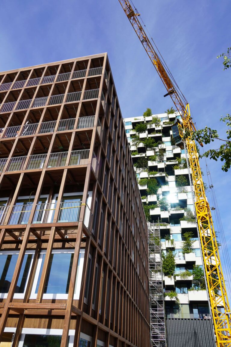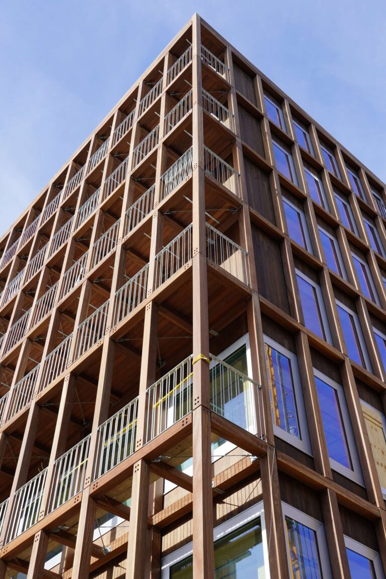 De constructie wordt gedeeltelijk uitgevoerd in hout, waarbij er gelamineerde houten kolommen en balken worden gecombineerd met CLT vloeren en een prefab betonnen kern.